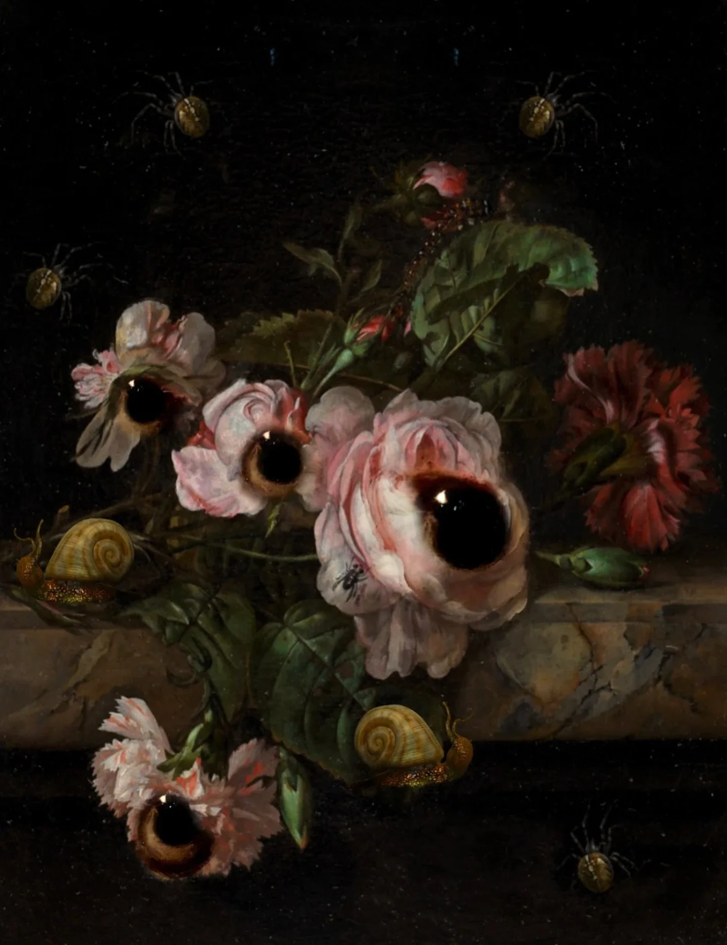 Graphic design with five abstract gold-colored shapes resembling eggs and crescent moons on a black background.