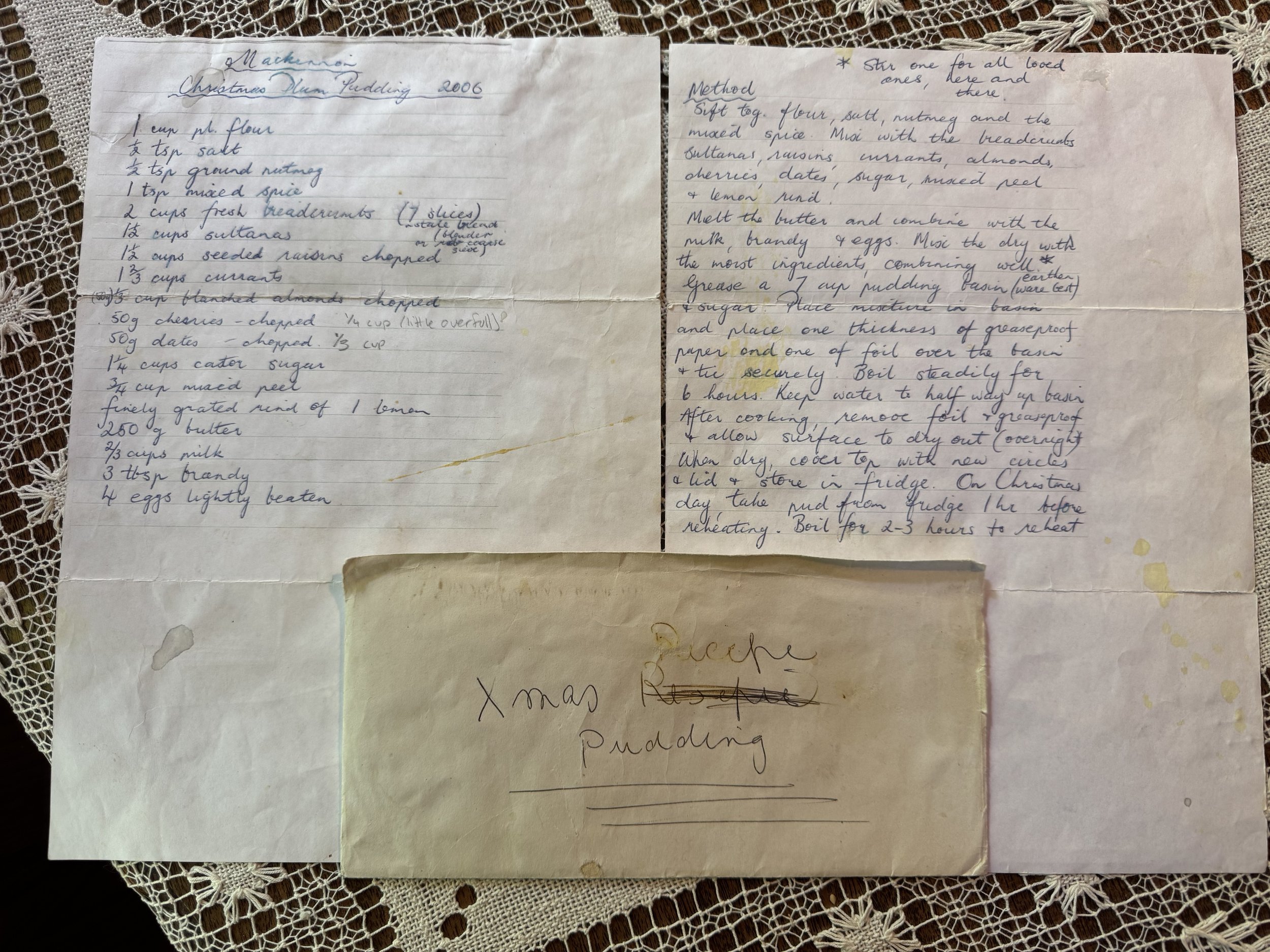 My Grandpa Allan always made the Christmas pudding six weeks out from Christmas Day. He made it from a recipe he’d cut out from The Age and stuck into his homemade cookbook. When Grandpa got cancer and became palliative in 2006, my grandma Doris cared for him with complete devotion in a hospital bed set up in the spare room. This was the same small room that had been the childhood bedroom for my mum and her three siblings, in their housing commission in Chadstone.